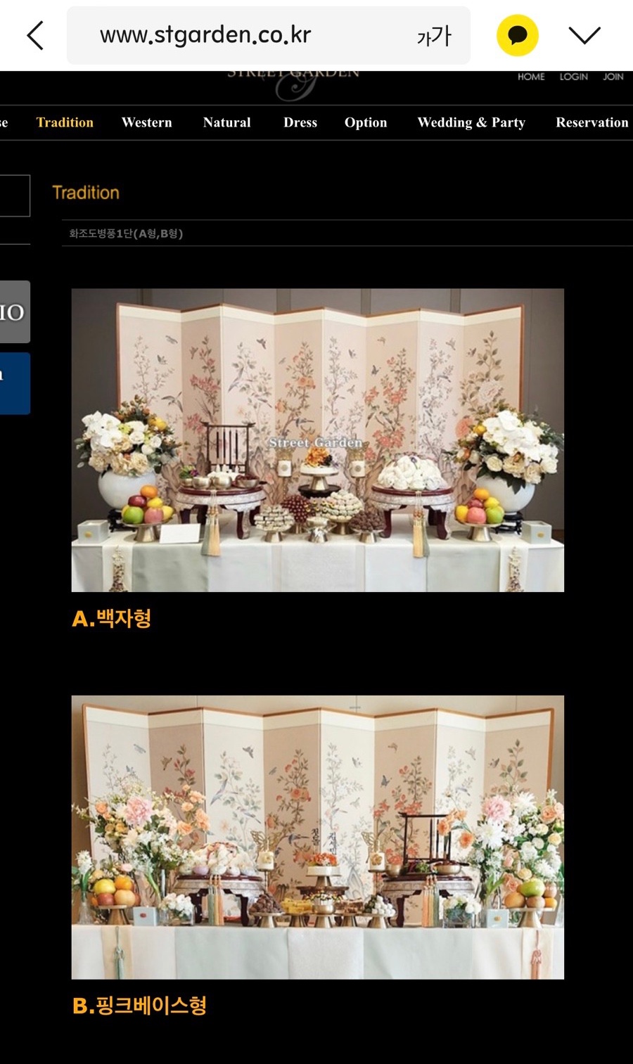 두 번째 업체는 예전부터 쭉 제휴 업체로 들어와있던 ‘스트릿가든’이라는 업체입니다. 워커힐 호텔 말고도 다른 여러 호텔들에 제휴를 맺고 들어가는 돌상 업체입니다. 세금 포함 가격으로 웨스턴에서는 크리스탈민트, 피치그레이스, 로얄네이비가 77만원 나머지는 66만원입니다. 하지만 웨스턴 돌상은 조금 촌스러워보이는 느낌입니다.