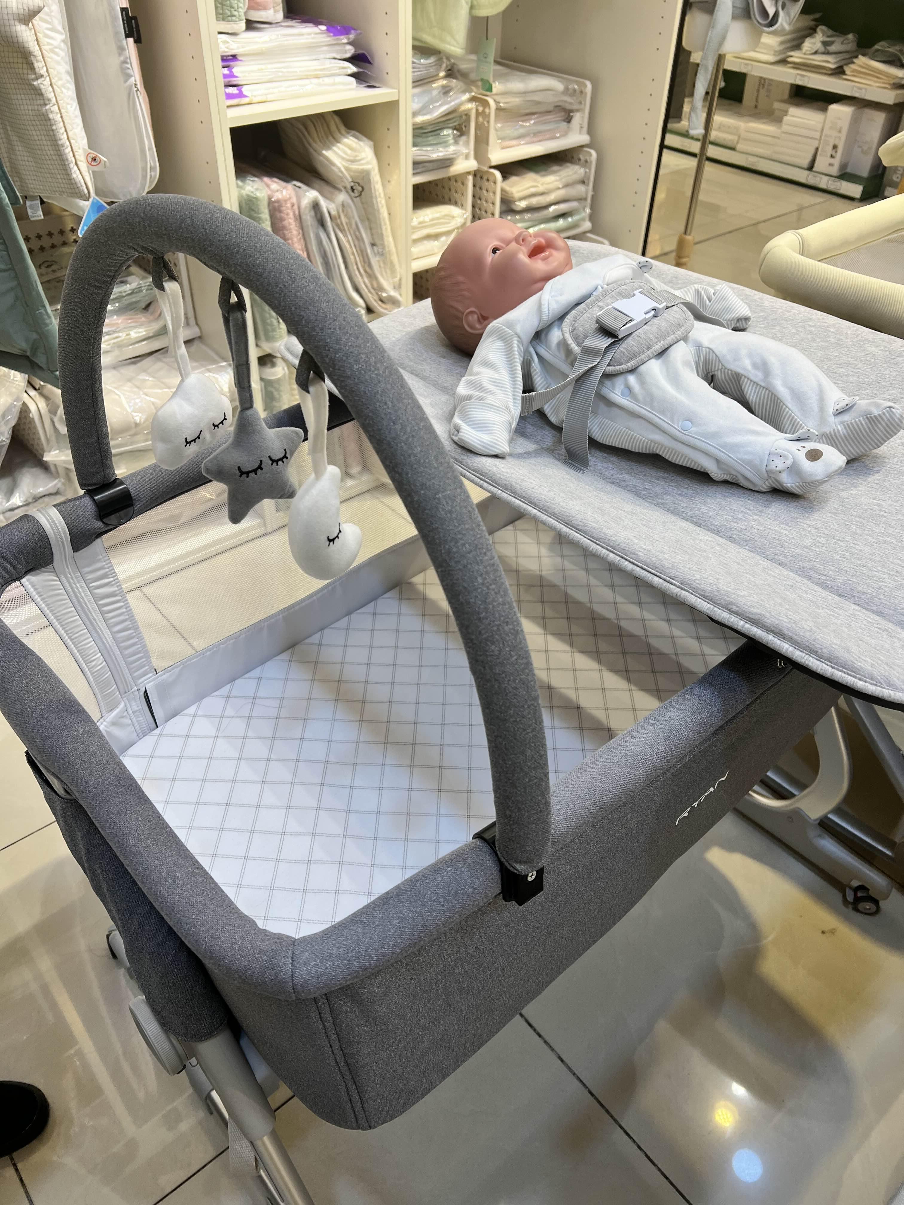 드디어 처음 보는 리안 드림콧 아기 침대 실물! 색상은 이 회색과 베이지색 두 가지인데, 저는 집의 인테리어를 고려해서 베이지 색상으로 사기로 했습니다. 보통 중고로 사거나 핫딜로 사면 베이지 색상이 인기가 많아 금방 품절이 되고 회색만 남는 경우가 많습니다. 위에 달린 모빌과, 다이어퍼 체인저(Diaper changer) 한국말로는 기저귀 갈이대입니다. 모빌은 각 침대용 두 개를 샀고(25,000원), 기저귀 갈이대는 두 개까지는 필요 없을 것 같아서 일단 하나만 샀습니다. 침대+갈이대 세트가 22만 원이었습니다. (인터넷에서 따로 사려면 5만 얼마입니다.) 사고 나니 후기가 그렇게 좋지는 않았습니다.(하지만 저는 잘 쓰고 있습니다.) 또 기저귀 갈이대 겸 수납장으로 사용되는 게 한 6만 원~7만 원대에 판매하는데, 짐을 늘리고 싶지 않아서 구매하지 않았습니다. 저희 집이 33평으로 그렇게 좁은 평수도 아닌데, 점점 아기 짐 때문에 좁아지고 있어서 최대한 짐 늘리는 것을 자제하고 있습니다.