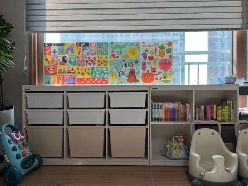 그리고 책장에는 두 칸에 책을 넣으니 충분했어서, 밑 칸에는 지금 계절에 안 맞는 여름옷을 보관한 박스도 넣어놨습니다. 이렇게 하면 옷장 속에 넣어둘 때 나는 쿰쿰한 냄새를 방지할 수 있을 것 같습니다. 그리고 한 칸은 자주 사용하는 장난감을 채워서 그냥 보이게 두었습니다. 이곳에는 그래서 주로 장난감 도서관에서 대여하는 물건을 보관해 둘 것 같습니다. 한 달 사용하고 반납해야 되기 때문에 눈에 띄는 곳에 두어야 좋기 때문입니다. 이렇게 저희 집 수납장을 어떻게 채워 넣었는지 공유드렸습니다.