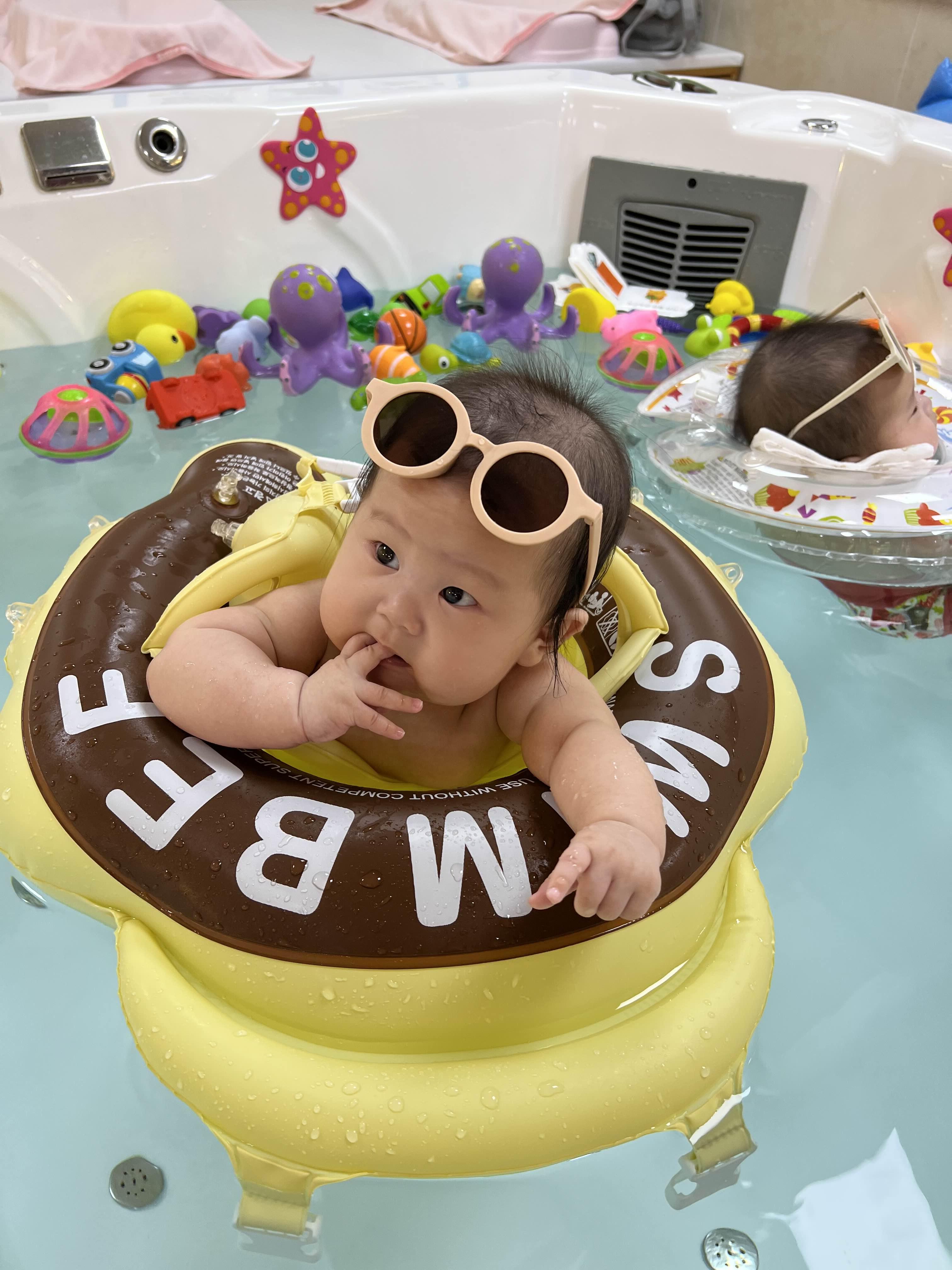 수영은 한 40분 정도 진행되는데, 처음에 먼저 몸풀기로 약간 연못 같은 데서 몸을 적신다. 10분 정도 물에 적응하도록 해 주고, 본격 풀장으로 들어간다. 6개월 이하는 소형 풀, 이상은 대형 풀로 배정된다. 우리는 대형 풀에서 했고, 처음에는 튜브 타고 좀 놀다가 중간에 선생님이 막 인공적으로 파도풀도 만들어주고, 욕조가 월풀 욕조라서 월풀 기능을 켜면 마치 캐리비안 베이 유수풀처럼 된다. 아가들 둘이 뺑글뺑글 돌았다. 튜브 종류도 꽤 다양해서 우리 지안이는 조금 체구가 작아서 처음에는 목 튜브를 하고 놀았다. 지유는 엎드려서 하는 스타일의 튜브로 놀다가, 둘 다 마지막에는 꽃게 모양 보행기 튜브를 하고 놀았음. 이 튜브는 실제로 괜찮은 것 같아서 나중에 놀러 갈 때 가져가려고 따로 구매도 했다.