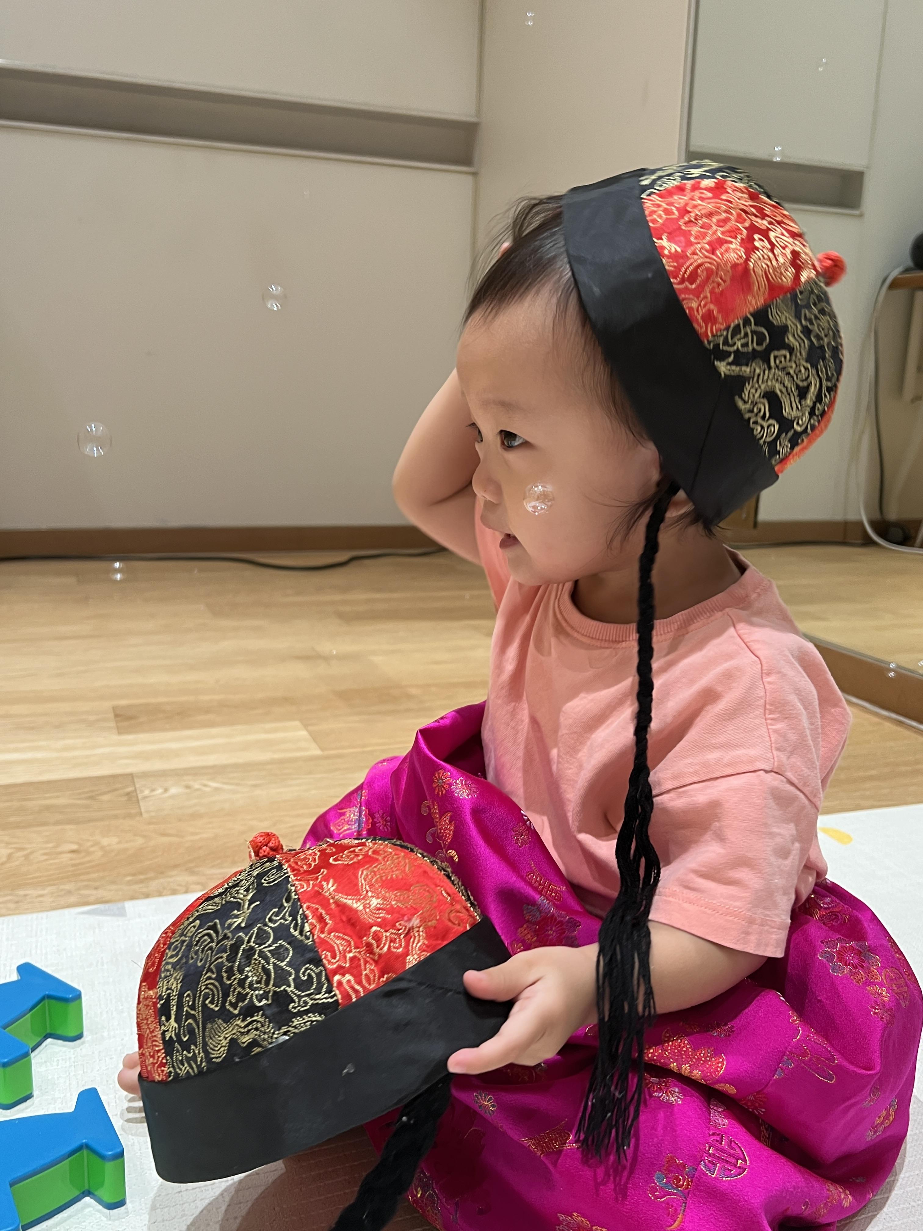 이 날은 중국 전통 의상을 입어보는 날이었어요. 너무 귀여워요. 비행기랑 헬리콥터로 슝 느린 박자, 두그두그두그 빠른 박자도 익혔어요.