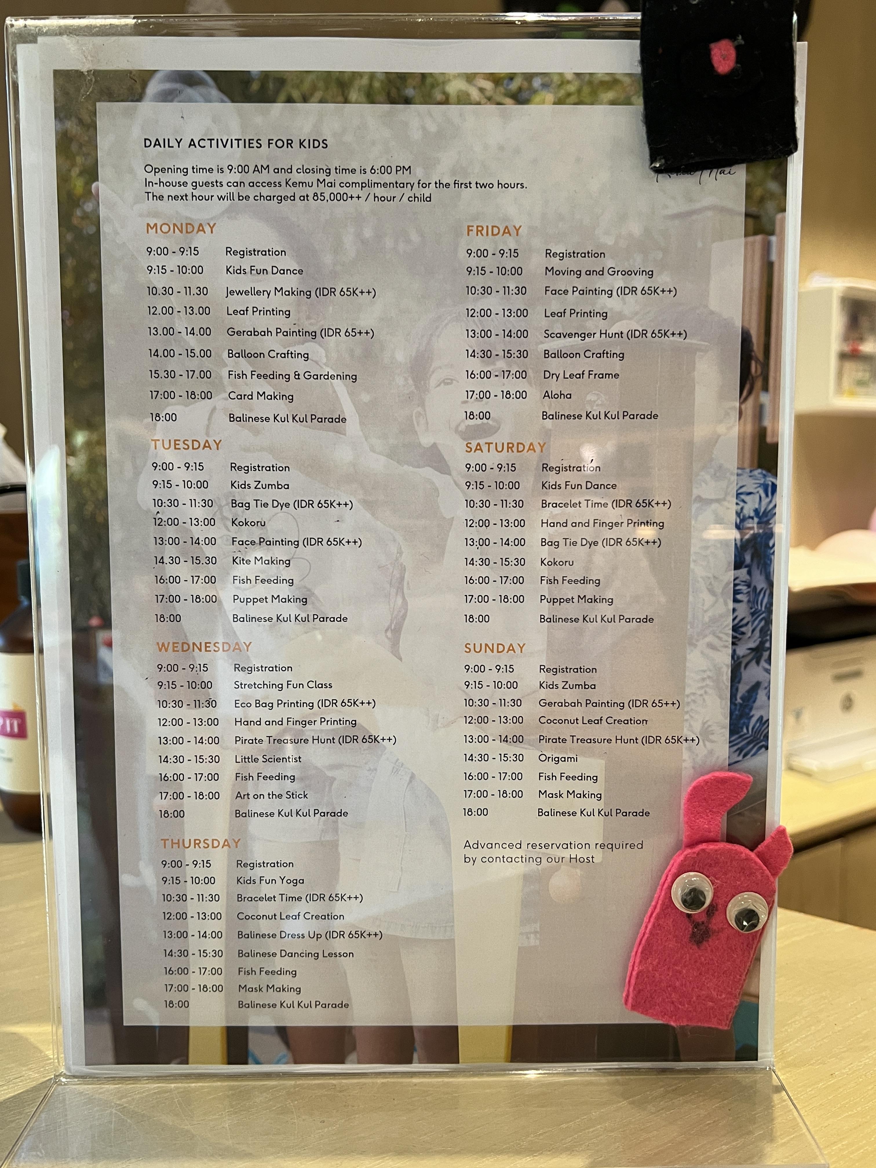 그 외에 요일별로 각종 액티비티도 있어요. 그 중에 무료도 있고, 요금이 부과되는 것도 있고요. 주얼리 만들기, 잎사귀 칠하기, 풍선 만들기, 물고기 밥주기, 카드 만들기, 발리식 퍼레이드 등등이 있어요. 당시에는 아기들이 어리기도 하고 정신이 없어 아무것도 참여하지 못했는데, 자세히 보니 할만한게 또 있긴 있어요. 물론 아이가 클 수록 참여할 수 있는 프로그램은 더 다양해요! 처음 이용해보는 키즈 클럽이라 다른 곳과 비교는 어렵지만 너무 좋았어요. 매일 매일 갔고, 2시간을 꽉채워 이용하지는 못했어요. 하루 한 시간씩!
