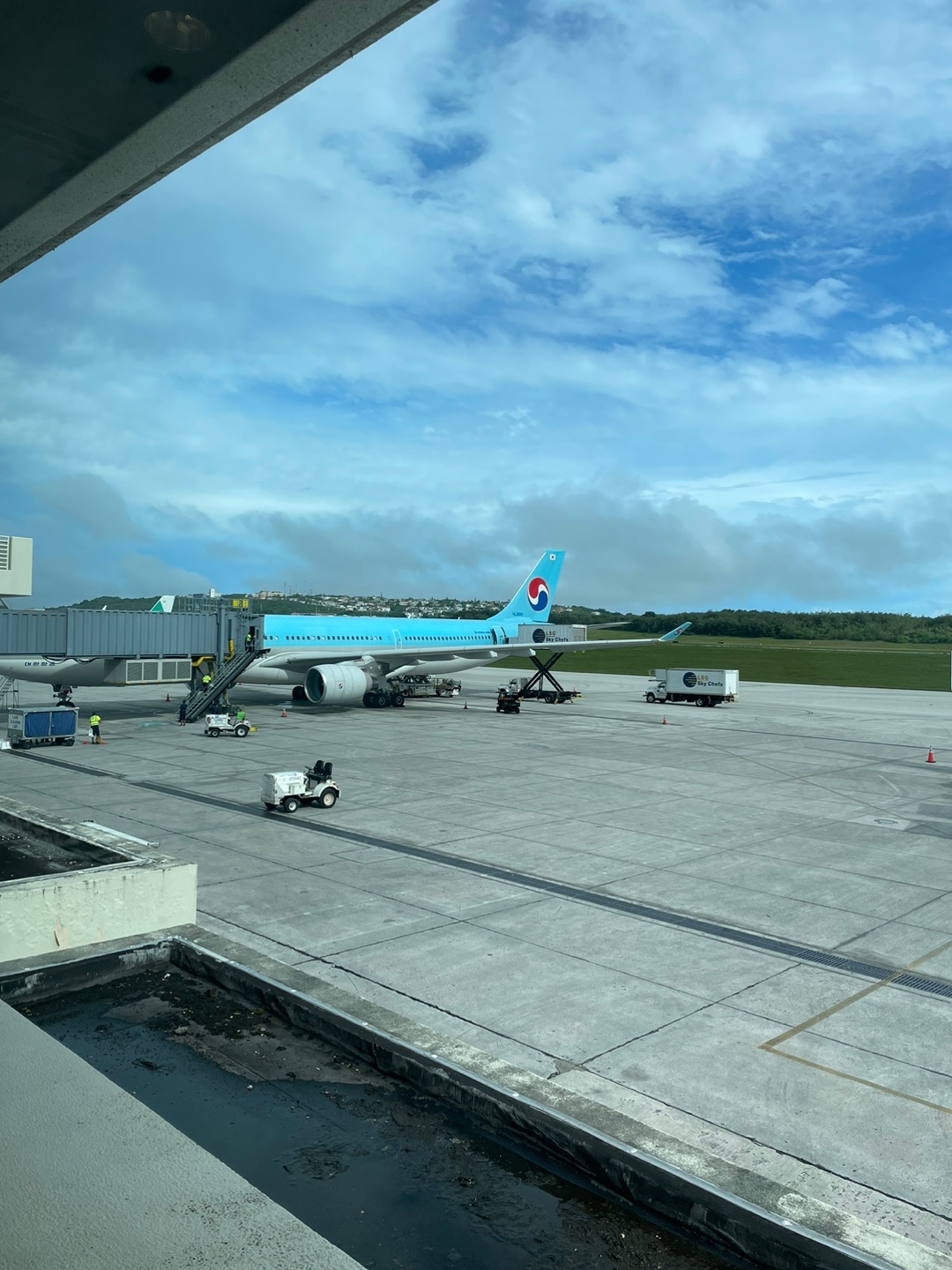 그리고 대한항공 C, D 쪽 카운터로 갔는데, 모바일 체크인이 남편 것만 안되어 조금 불안했지만 다행히 미국령 입국 시 하는 그 안전 관련 검사에 걸린 것은 아니었다. (SSSS라고 함) 아기랑 함께 타는 거라 산소마스크 관련 주의사항을 들어야 되어 그런 것이었다. 다행이었지만, 줄이 어마어마했음. 대한민국 쇼트트랙 국가대표 선수단도 캐나다로 월드컵 출전 때문에 출국하는 것 같았다. 사실 핑크 머리 곽윤기 선수만 봐서 꽉 잡아 윤기 유튜브 찾아보고 나중에 알게 되었음. 여하튼 우리는 일반 체크인 줄을 설 것인지, 아니면 카운터에서 체크인해서 티켓을 받고 셀프로 짐을 부칠 것인지를 선택하라고 했는데, 그냥 일반 체크인이 더 빨랐을 것 같다. 그렇지만 우리는 오빠가 줄 서있는 동안 아기 분유를 먹이기로 했기 때문에 어차피 선택은 바꿀 수 없었을 것 같다. 엄마가 같이 가주셔서 엄마한테 잠깐 부탁드리고 난 환전도 해왔다. 요즘에는 비대면으로 ATM으로도 환전이 가능하다. 그리고 미리 신청도 안 했는데, 그냥 현금인출 가능한 본인 명의 체크카드만 있으면 신한은행에서 계좌 없이도 가능하다. 괌에서는 대부분 카드가 된다고 해서 300달러만 환전했는데, 거의 팁 주는 용으로만 사용했다. 1달러짜리로 환전을 많이 할 걸 그랬다. 10, 100 달러로 나눠서 해서 호텔에서 소소하게 팁 드려야 할 경우 못 드리기도 했다. 죄송합니다…