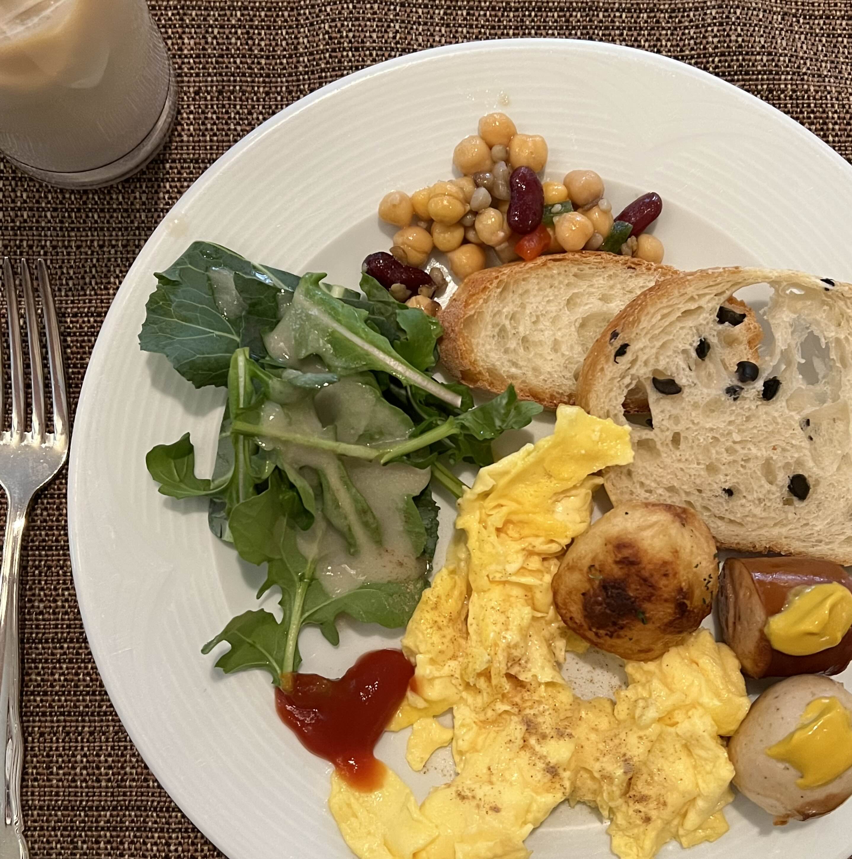 그리고 F&B 부문. 일단 아기랑, 강아지랑 가게 되어 호텔 내에 다 같이 갈 수 있는 식당은 없었다. 유모차 반입 가능한 식당은 있을지 모르겠다. 일단 우리는 쪼꼬 혼자 객실에 내버려 두고 가고 싶지 않아서 무조건 포장으로 버텼다. 2박을 했기 때문에 하루는 중식당 금룡에서 포장했고, 하루는 피자힐에서 피자 한 판을 포장했다. 결론적으로는 돈은 돈대로 들고 만족스럽지는 못했다. 직접 가서 먹으면 분위기 값이라고 생각이 들었겠지만. 좁은 객실 내에서 먹으니 그 정도의 가격을 내고 먹을 정도가 아니었다. 그랜드 워커힐에 피자힐 포장이랑 와인 파는 가게인 에스테카가 있는 것은 좋았다. 특별한 날이니까 떼땅져 샴페인을 사서 피자랑 같이 먹었다. 물론 다른 피자에 비해 비싸긴 하지만 피자힐의 도우는 특별하니깐. 근데 지난번이랑 같은 피자를 먹어서 아쉽긴 했다. 포장 피자는 딱 세 가지라 아쉬운 부분이다. 제일 좋았던 것은 조식이었다. 더 뷔페에서 두 번의 조식을 먹었고, 물론 아기와 쪼꼬를 돌봐야 해서 혼자 다녀오고 바통 터치해서 다음 사람 다녀오고 했지만 너무 맛있었다. 종류가 엄청 많은 것은 아니지만 호캉스에서 조식을 빼면 너무 아쉬운 것 같다.