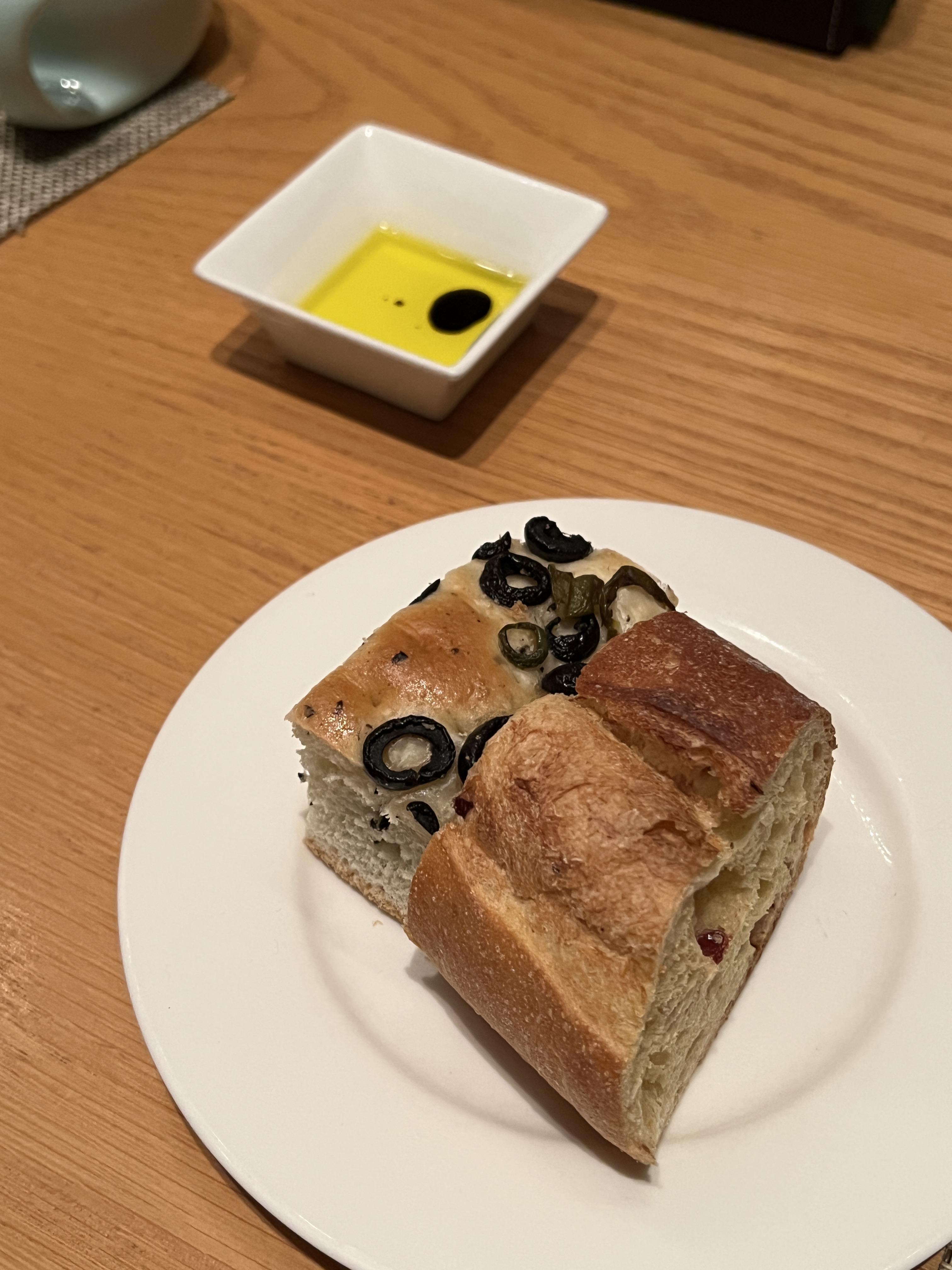 식전빵이 먼저 나왔습니다. 올리브 치아바타랑 바게트입니다. 저는 잠시 아기가 필요한 것을 가지러 갔다 오느라 조금 식은 채로 먹었습니다.