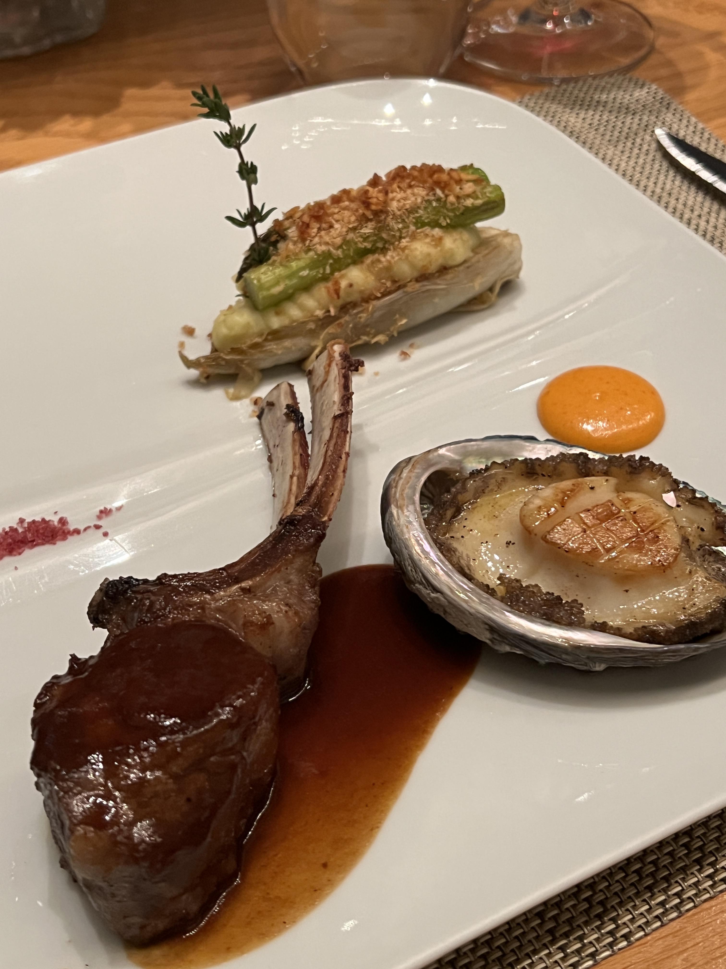 드디어 메인요리! 양갈비 아니면 소고기 스테이크 중 선택할 수 있습니다. 저는 양갈비를 선택했습니다. 갈비 두 대가하나로 붙어 구워서 나왔습니다. 스테이크 소스가 쫙 뿌려져 있고, 추가로 소금과 소스도 줍니다. 전복도 한 마리 같이 나오는데 고기가 육향이 강해서 전복은 약간 들러리 느낌이었습니다.
