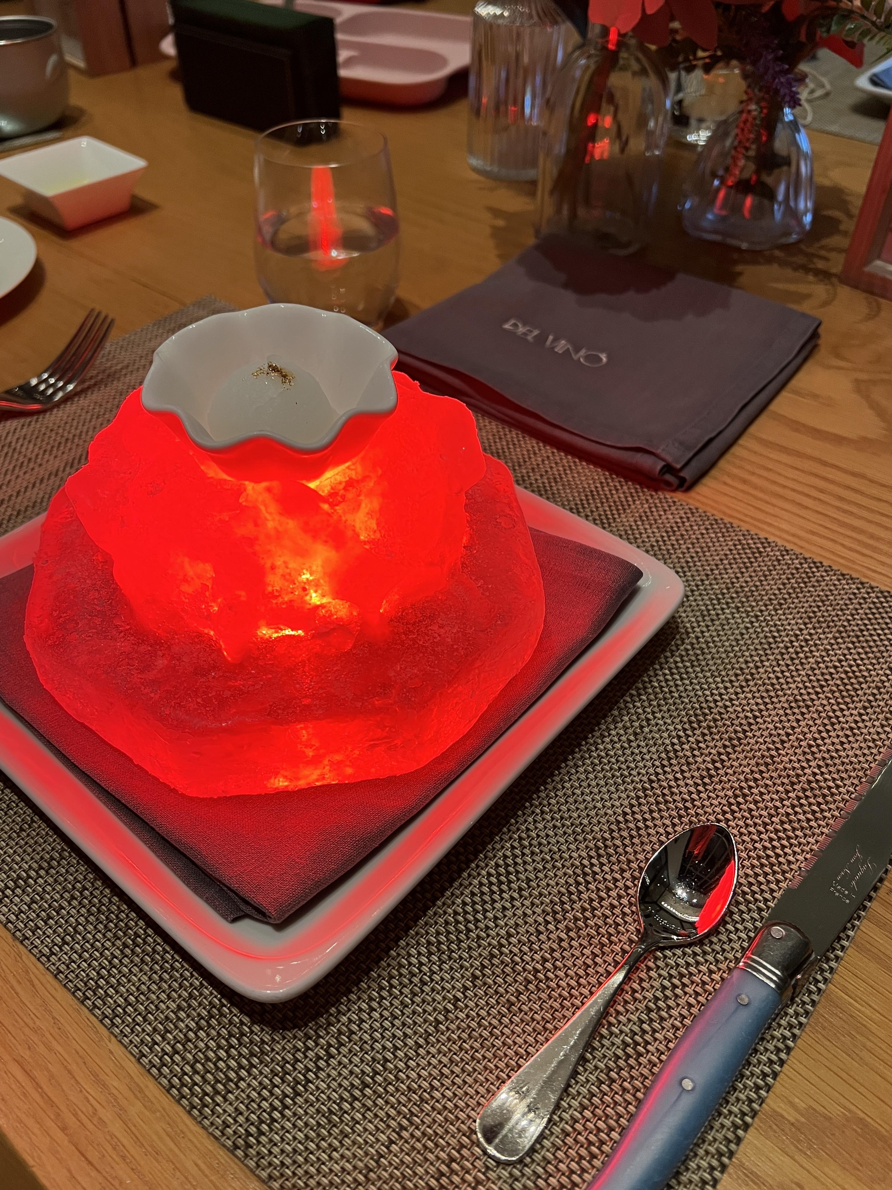 그다음 메인 요리가 나오기 전 입가심을 하라고 레몬셔벗이 나왔습니다. 1년 동안 고생한 아기 엄마 아빠에게는 이렇게 특별히 얼음을 카빙 해서 그릇 받침대를 만들어주셨습니다. 감동입니다.