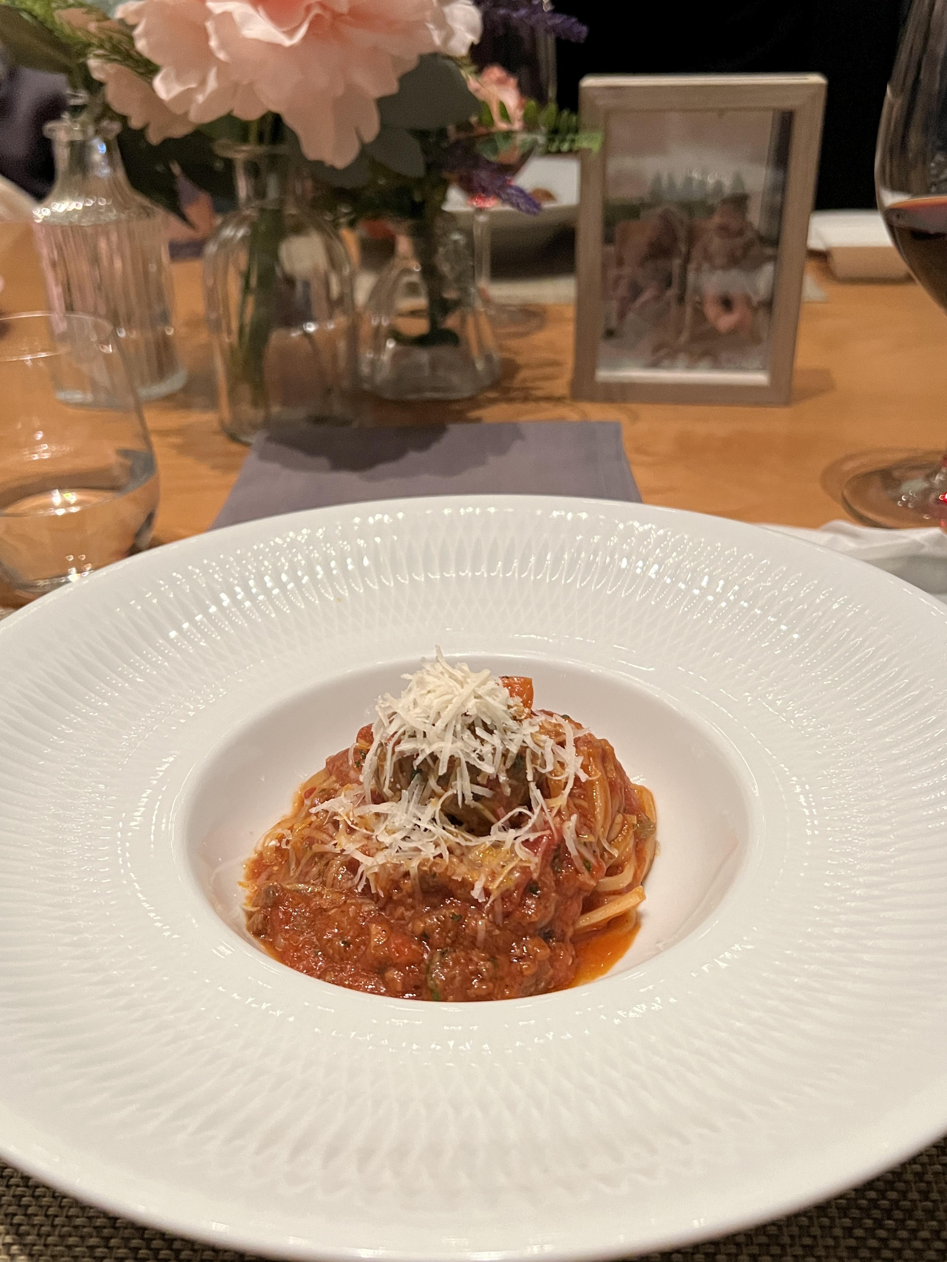 다음은 본격 요리가 나오기 시작합니다! 라구 소스를 올린 토마토 파스타입니다. 너무너무 맛있었습니다. 치즈도 너무 고소하고, 이것만 단품으로 판다면 기꺼이 사 먹을 의향이 있을 정도입니다. 리필해서 더 먹고 싶었습니다. 면 굵기랑, 익힘 정도도 딱 알맞았고요.