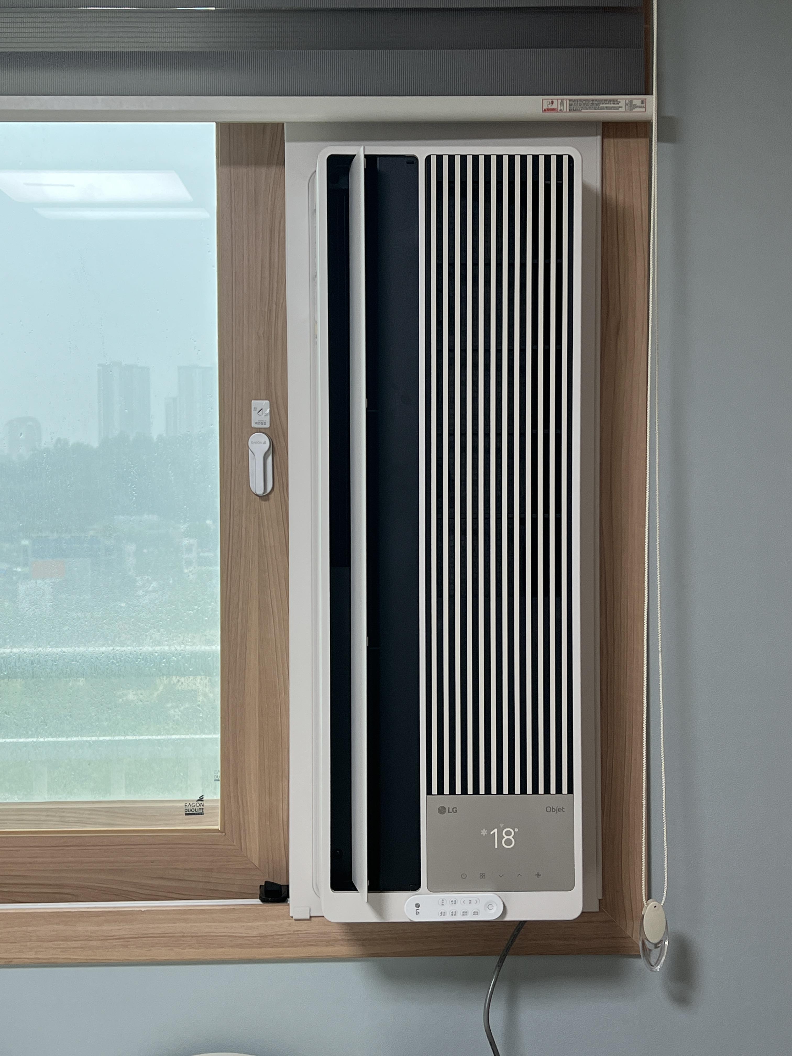 그래서 사실 그냥 벽걸이 에어컨 달려고 결제까지 다 하고 왔으나, 배송 기사님이 아기 방쪽은 확장을 해서 실외기에서 물이 빠지는 배관이 없다는 청천벽력같은 이야기를 해주셨다. 그래서 결국 설치 실패하고 환불 처리했다. 당연히 달 수 있을 줄 알았는데, 어지러웠다. 이제는 어떻게 해야하나 하다가 결국 결정한 창호형 에어컨. 창호형은 실외기가 필요없어서 설치가 아주 간단하다는 장점이 있었다. 대신 소음이 심하다고 들어서 고민을 많이 했고, 파세코, LG, 삼성 세 가지중에 고민하다가 결국 LG로 결정했다. 나는 사실 비슷비슷하다면 디자인으로 선택하는 편이라. 그리고 정신승리일수도 있지만 소음도 적다고 했다.