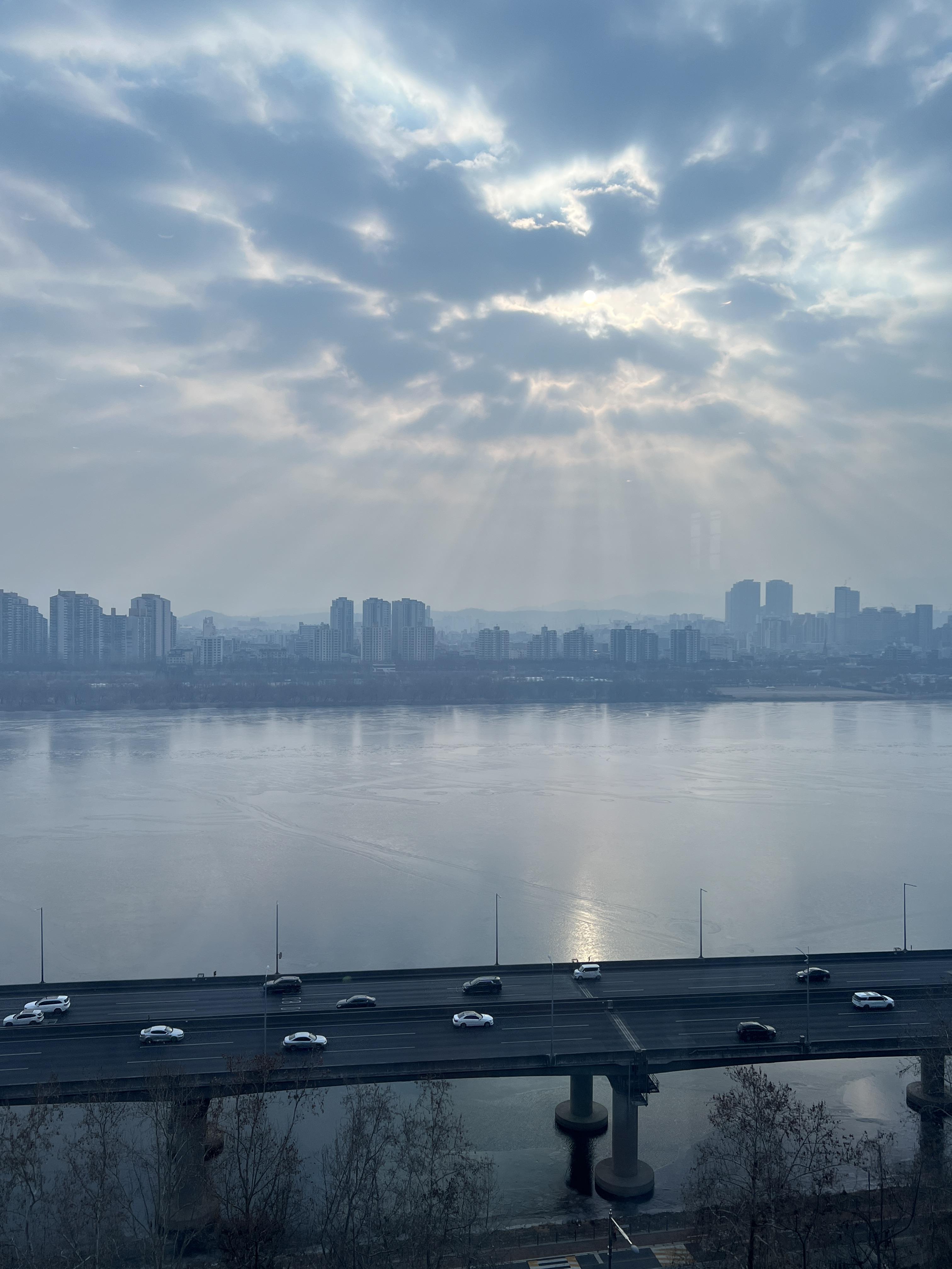 델비노에서 즐길 수 있는 뷰입니다! 너무 멋지지 않나요? 얼어붙은 한강이지만, 또 그만의 매력이 있습니다. 봄, 여름, 겨울에 와봤으니 가을에만 한 번 더 오면 되겠습니다.